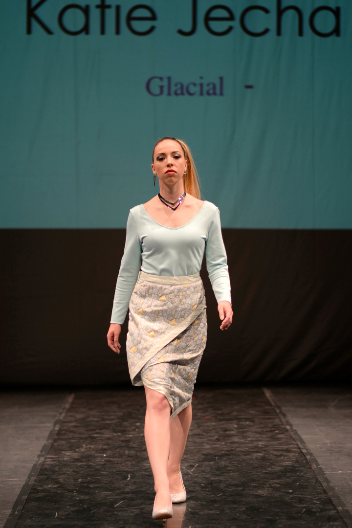 Glacial is a fall to winter, day to evening women’s wear collection. It is inspired by the harshness and yet beauty of ice and snow. It takes geometric patterns and silhouettes and pairs this with soft grey and icy blue hues that are reminiscent of the light reflecting off the wintery landscape.